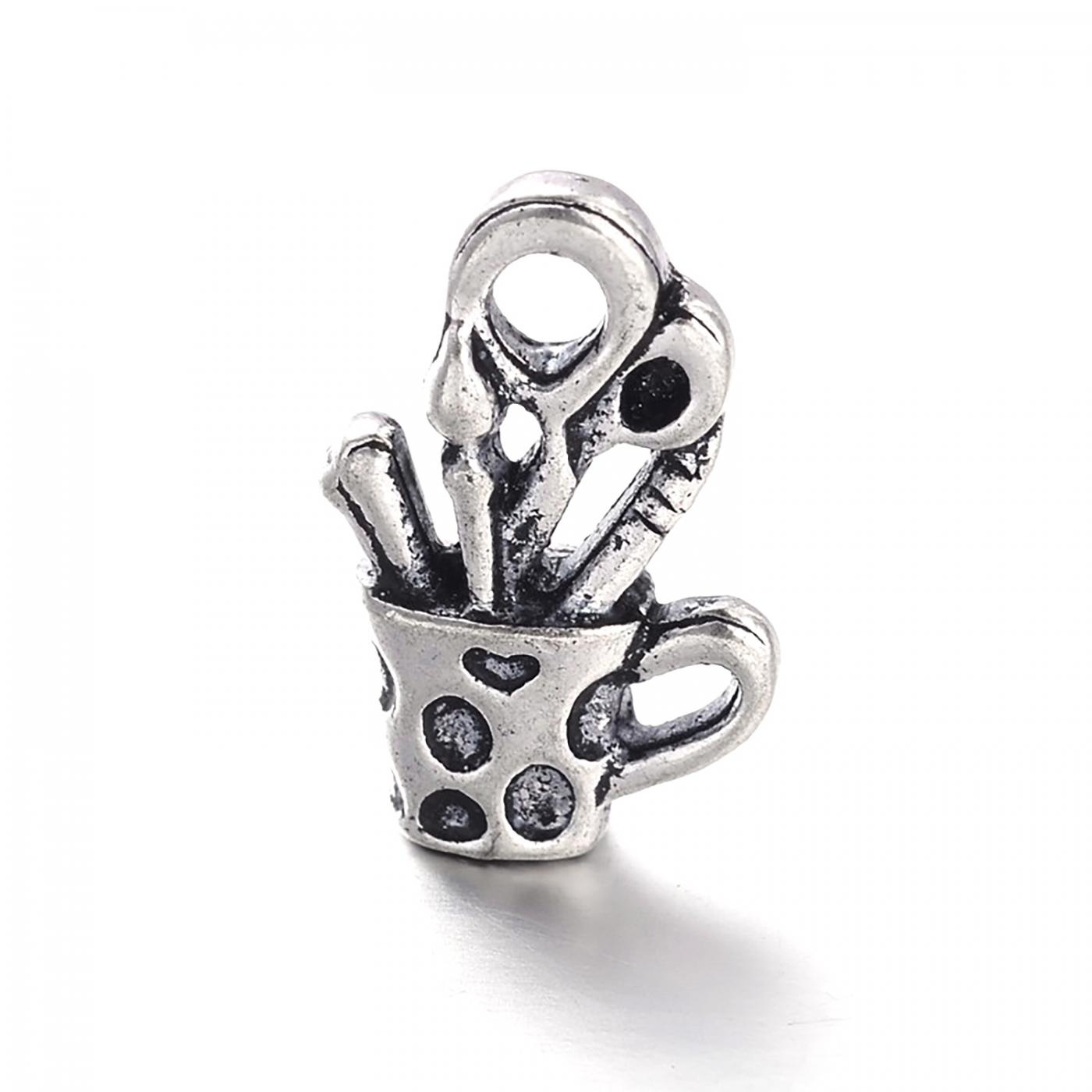 Kovová korálka v tvare šálky so štetcami a nožničkami. Korálka má vo vrchnej časti očko na navliekanie s priemerom 2 mm.