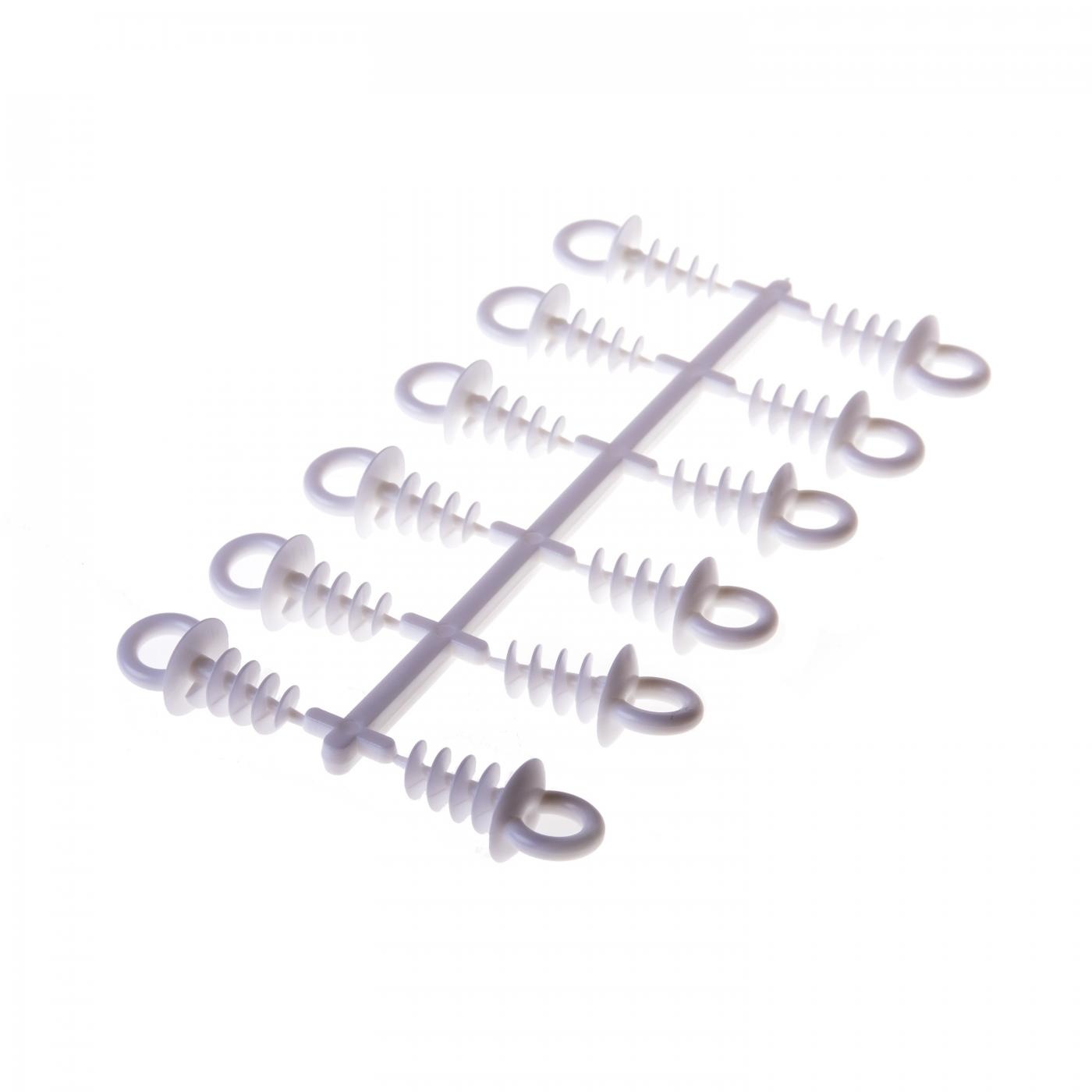 V balení sa nachádza 12 kusov očiek v mliečnej bielej farbe. Očká sú vyrobené z plastu.