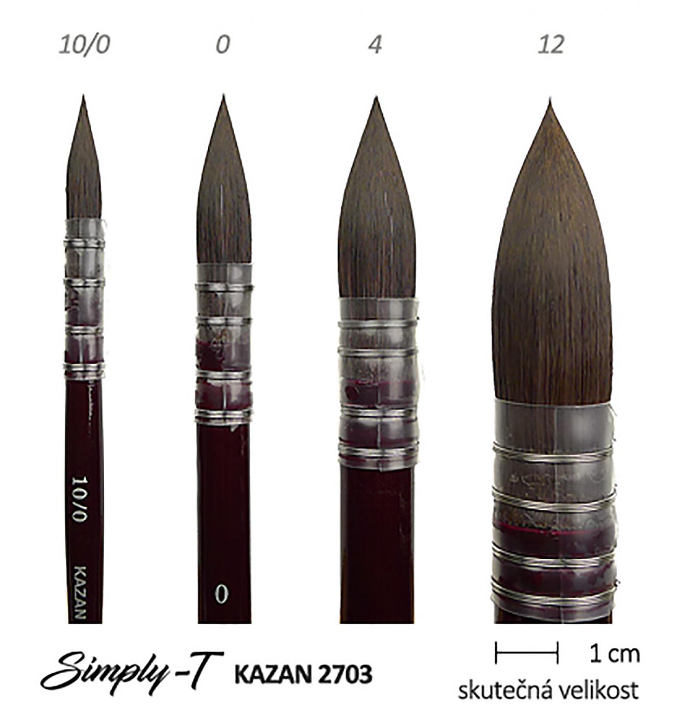 Štetec t-brush Kazan okrúhleho tvaru má syntetické štetiny Kazan. Tieto štetiny sa vyznačujú o 17% vyššou kapacitou zadržovania vody ako prírodný vlas. Preto je ideálny a veľmi obľúbený najmä pri maľovaní akvarelom. Má kratšiu, no veľmi praktickú drevenú rúčku dlhú 14,8 cm.