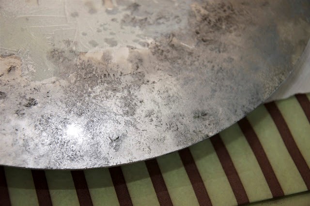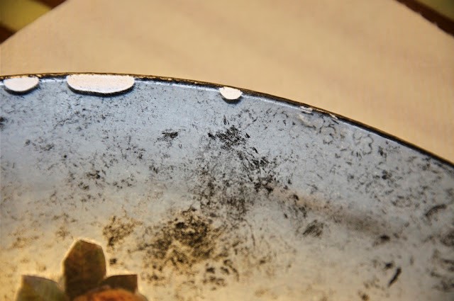 Následne naneste čiernu akrylovú farbu na zadnú časť misky. Tam kde ste utreli zrkadlovú farbu, krásne vynikne čierna a dodá miske antický vzhľad.